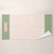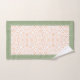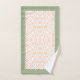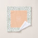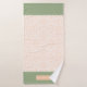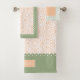 Sage gree, peach and white damask pattern and scalloped borders Bath Towel Set. The bath towel features an elegant peach and white damask pattern and sage green bands on the short sides with scalloped edges. There is also a frame with your family name. The hand towel showcases a scalloped border around it while the wash cloth is in speach colour in the centre with a damask border and your monogram. You can personalise it with your family name and monogram.