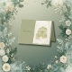 This sage green wedding table number captures the romantic atmosphere of a cosy garden café, framed by soft botanical details and vintage charm. The gentle sage tones bring a sense of calm, elegance, and timeless beauty, making it ideal for couples who dream of a wedding inspired by nature, outdoor venues, or rustic courtyard settings. The delicate bicycle with flowers, leafy border, and charming café backdrop create a warm and welcoming scene that feels both intimate and refined.