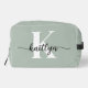 This simple, elegant sage green toiletry bag with your first name in a trendy script font in black and your first initial in a modern cap font in white is perfect for you. It's stylish and trendy and yet very classic. It will be fabulous for school, the gym, work, your car - will make keeping your makeup or toiletries all in one place when you're away from home.