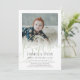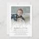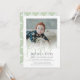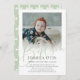 Minimalist baptism invitation in with baptism written in a pale green brush script. Add name and text in soft grey. Personalise with a photo of your baby. The back features a green and white pattern with crosses.