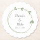 Set of 6 round, absorbent, pulp board drink coasters for wedding showers, wedding receptions, and even rehearsal dinners that feature a trendy, sage green colour, simple heart wreath design along with the bride and groom names and wedding date printed in dark grey, stylised lettering. Edit and replace names and date with your own.