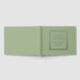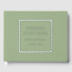 Solid sage green colour, simple wedding guest book with stylised foil print within a square border that features the bride and groom's name along with wedding date in your choice of colour foil print. Seen here in silver foil print. Select your guest book style.