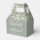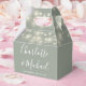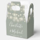 Elegant wedding favour box featuring pretty string lights, chic signature script names and special date on a sage green background. You can personalise with your own thank you message on the reverse. A perfect way to say thank you to your guests! Designed by Thisisnotme©