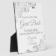 This elegant self standing sign or plaque will welcome guests to sign your wedding guest book. Fully customizable, it features a simple sophisticated yet fancy design with sage green & gray text on a white background with a silver faux foil frilly floral filigree in the corners.