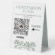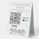 This sage green wedding tabletop sign is the perfect way to help pay for your honeymoon. Add your own honeymoon fund working and personal Venmo QR code image for your honeymoon fund sign to politely ask for money. Display this sign at your wedding reception, at your gift table, guest book table, and other locations in your reception hall. Paying via Venmo is a fun way for wedding guests to gift money for your wedding honeymoon. This Venmo display sign can also be used at your honeymoon bridal shower.
