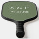 Sage Green Wedding Pickleball Paddle, please personalise with initials of the couple and the date of the wedding, using the online personalisation template before ordering. The text automatically copies across to the other side of the paddle to show the same initials and date on each side. A stylish pickleball paddle featuring elegant white text on a lovely sage green colour. Great as a wedding gift or as a favour for someone special and also a way to get involved with outdoor games at a destination wedding / wedding celebration.
