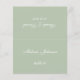 A simple sage green wedding place card with the guest name and the table number printed on its front and the bride and groom names and the wedding date printed on the other side (that is the other half, before folding it). All text is white calligraphic script.