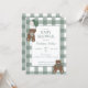 If you can "bearly" wait for the arrival of baby boy, customize this shades of sage green, creme, and white buffalo check (plaid), teddy bears, ribbon bows, and balloons baby shower invitation. The back of the card features the same gingham background.