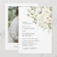 This invitation pairs soft watercolor white blooms and airy sage greenery on the front with a full-photo layout on the back, allowing couples to showcase their engagement or favorite portrait as part of their wedding stationery. The balanced composition and modern classic typography create a refined, editorial look while preserving a personal, emotional touch.