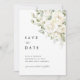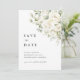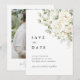 A refined sage green and white floral save the date design featuring soft watercolor blooms and an elegant photo back layout.