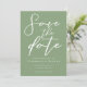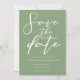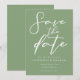 This simple solid sage green save the date card features elegant white script for an outdoor ceremony in a nature setting. Minimalist typography on a peaceful light green invitation for a rustic venue outside near a forest of trees.