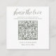 Sage green and white share the love QR Code cards. Place these small cards at your wedding reception tables so guests can scan to upload the photos they took at your wedding reception to your album or social media. To generate a new QR code on the design, add the URL of your online wedding album or social media handle in the area provided, using the "personalise" feature. A brand new QR code will then be added to to the design.