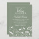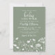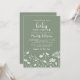 Simple Wildflower Boho Baby Shower Invitation. Perfect for spring through autumn celebrations, this minimalist design features a sage green background on both the front and back for a calm, earthy, and timeless look. A simple white outline wildflower art border sits along the bottom, creating a clean green-and-white palette that feels elegant, modern, and subtly cute.
