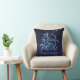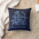 Throw pillow featuring the zodiac symbol for Sagittarius in soft silver blue, overlaid with the stars of the constellation, against a starry sky background graded from deep midnight blue to black.