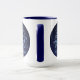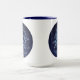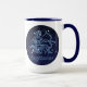 Mug featuring the zodiac symbol for Sagittarius in soft silver blue, as a round medallion, overlaid with the stars of the constellation, against a starry sky background graded from deep midnight blue to black.