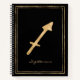Stylised hammered gold Sagittarius astrology zodiac birthday symbol in a hand drawn gold double line frame. A hardcover or softcover notebook with your choice of inside pages. Choose from sketchbook, bullet journal, checklist, graph paper, recipe book, or lines in various widths and colours. Customisable. Aquarius text in a fine script on the front cover can be personalised, text can also be added on the back.