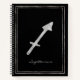 Stylised hammered silver Sagittarius astrology zodiac birthday symbol in a hand drawn silver fine double line frame. A hardcover or softcover notebook with your choice of inside pages. Choose from sketchbook, bullet journal, checklist, graph paper, recipe book, or lines in various widths and colours. Customisable. Aquarius text in a fine script on the front cover can be personalised, text can also be added on the back.