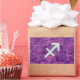 A mother of pearl Sagittarius zodiac symbol on a vibrant fuchsia pink digital camouflage design texture print background. A modern urban racy design for a great custom birthday gift idea.