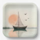 A sailboat drifts serenely on calm water with a large orange sun setting in the background and birds flying nearby