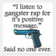 This sarcastic Gangster Rap design is a great gift idea for any occasion: I listen to gangster rap for it's positive message. Said no one ever.
