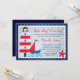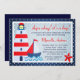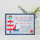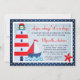 Cute baby shower invitation for boys with sailing theme. A deep ocean blue and white polka dots pattern on the background; Illustrated with a sailboat, a starfish and a lighthouse. Written "ships ahoy! it's a boy!". Some elements by Baby Star Design.