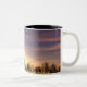 Behind the silhouettes of bare leafless winter tress a phantom ship sails through the clouds of a sunset sky.