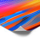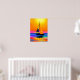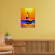 Poster in a vibrant sailboat with colourful sails glides across the water, reflecting the stunning hues of a radiant sunset. The sky and sea create a mesmerising blend of orange, yellow, blue, and coral tones