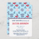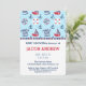 Ahoy! It is a boy! Invite friends and family for the joyous arrival of your baby boy with this classy and elegant nautical baby shower invitation! It has a cute pattern made using a little sailboat with a sail of colourful stripes pattern and a star on its board, an anchor, a compass, a buoy and a cute baby tee in blue and white stripes. The colour palette of red, white, blue is perfect for a nautical theme party for a little sailor baby boy! Personalise easily with your party details.