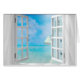 Open window with sheer curtains overlooking a sailboat and white lighthouse for Name Day