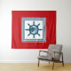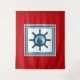 Nautical themed design with sailing scene decoration in striped squares on red background