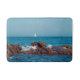 A photograph of a sailboat on the horizon, and waves crashing into the rock formation near the shore.