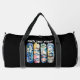 This black duffle bag features four vertical panels with vibrant watercolor nautical elements, including a fish on an anchor, a sailboat, a fish with a seashell, and a lighthouse with a dolphin, all under the text "SAILING VIBES." Edit colour of the bag caps and body in the Design tool to your favored colours.