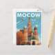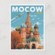A vibrant vintage-style travel poster featuring the iconic Saint Basil's Cathedral in Moscow, Russia. The illustration highlights the cathedral's famous colourful domes and unique architecture against a clear blue sky with a plane flying overhead, leaving a trail. This retro design is perfect for those who love European travel, historic landmarks, or the rich culture of Russia. It evokes a sense of adventure and wonder, making it an ideal piece of art for any space.