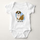 Cute Saint Bernard baby creeper and other apparel! A drawing of the canine, pink tongue hanging out, is in the centre with a light blue background. Adorable dog animation made especially for St Bernard owners! Original dog art Copyright © Menagerie Mayhem.
