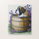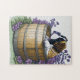 This delightful jigsaw puzzle features a charming Saint Bernard dog nestled snugly inside a rustic barrel amidst a picturesque backdrop of vibrant purple flowers.