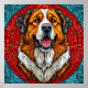 Colourful and artistic illustration of a Saint Bernard dog, featuring a vibrant background with a red circular mosaic pattern. The dog's expression is happy, showcasing its prominent fur and facial features.
