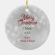 On the front of this Holiday ornament is an image of an adorable Saint Bernard puppy wearing a Santa hat and wrapped in coloured Christmas lights. The image is set against a festive silver bokeh background. The back of the ornament has the same background with your custom text in red and green. Cute for anyone, but especially for kids from a parent or grandparent.
