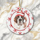 On the front of this Holiday ornament is a beautiful watercolor image of a Saint Bernard wearing a red and white striped Santa hat. The image is placed on a white circle framed by a retro red snowflake pattern. The back of the ornament has the same background and circle with your custom text in white on a matching red background. Cute, especially for someone who loves a Saint.