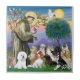 Saint Francis, the patron saint of animals, blesses ten dogs as a rabbit and racoon watch and a dove hovers above their heads.