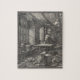 Saint Jerome in His Study by Albrecht Durer, 1514, is a large and unusually detailed copper plate engraving depicting the saint writing in his study surrounded by objects of symbolic importance. A small dog and lion doze in the foreground. This print may be among the first to depict the effects of light and shadow in the difficult metal plate medium, and foreshadows similar work by Rembrandt and later generations of artists.