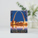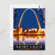 Saint Louis poster. Gateway Arch over the city. Water reflections. Travel postcard in bright colours and blue background.