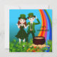 A boy dressed in green and a cute girl dressed in a pretty green dress with printed shamrocks fabric and wearing an emerald-green top hat is cheering and clapping her hands because it’s also her birthday.