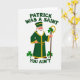 This greeting card shows a stylized Saint Patrick figure standing in the center on a bright white background, dressed in an emerald green robe with gold trim and a matching cap. He has a full white beard and a rosy nose, giving him a friendly, slightly teasing look that feels like an inside joke shared between close friends 💚. In one hand, he holds a slender shepherd’s crook with a gold curl that stands out against the green. Three green shamrocks float around him, spaced to the left and right like small accents that keep the scene light and balanced ☘️. Above the figure, green lettering curves in an arc reading “PATRICK WAS A SAINT.” Below him, more green text sits in a straight line reading “YOU AIN’T,” landing like a cheeky punchline. The greens and golds stay rich against the white space, with the shamrocks and crook curl echoing the same tones across the design. The robe’s folds, the gold edging, and the three shamrocks are the main details against the open white field.