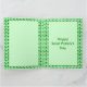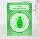 This big card features a graphic image of a cute little green bee with light and dark green stripes and green antennae. This cute little bumblebee is ready to celebrate Saint Patricks Day. The bee is surrounded by a pattern of light and dark green shamrocks to complete the design.