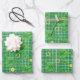 A set of three coordinating green plaid and shamrock wrapping papers with just a touch of gold.