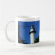 The lighthouse at Saint Simons is a working lighthouse and museum that is open to the public. Enjoy a photograph of the white lighthouse against a bright blue sky.