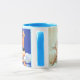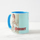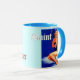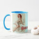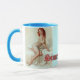 The two-tone Saint & Sinner ringer mug has two vintage pinup girl images and coordinating aqua blue background. Text is in red and white.