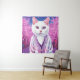 Introducing our delightful tapestry featuring whimsical fantasy art: a jazzy kitty adorned in a stylish cardigan, gallivanting among blooming cherry trees in full springtime splendour.