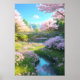 This digital artwork showcases the serene beauty of a small stream with cherry blossom trees on either side, meeting in the middle with a charming stone bridge. The delicate pink petals of the cherry blossom flowers contrast against the tranquil blue water, while lush greenery in the background creates a breathtaking view. The art piece captures the essence of spring and the peacefulness of nature, making it a perfect addition to any nature lover's collection.