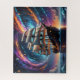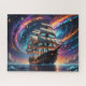 A tall ship under full sail glides though a calm sea under a colourful, magical sky of galaxies, planets, and stars. Beautiful, dreamy image.